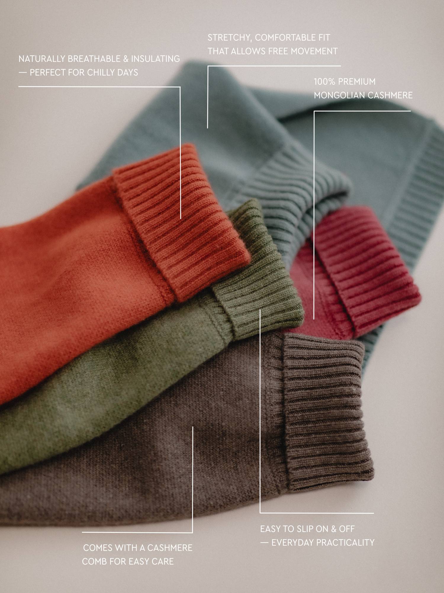 Der Kaschmir Hundepullover wird aus 100 % hochwertigem Kaschmir gefertigt und bietet außergewöhnliche Weichheit, Wärme und Atmungsaktivität. Das leichte, aber dennoch kuschelige Strickmaterial sorgt an kühlen Tagen für genau die richtige Isolierung – und ermöglicht gleichzeitig uneingeschränkte Bewegungsfreiheit und höchsten Tragekomfort für deinen Hund.